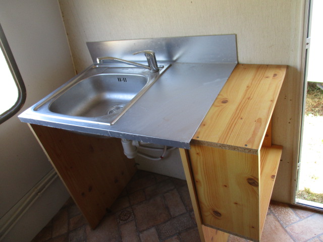 Felszereltség: mosogató, gáztűzhely, mosdófülke, fellépő.